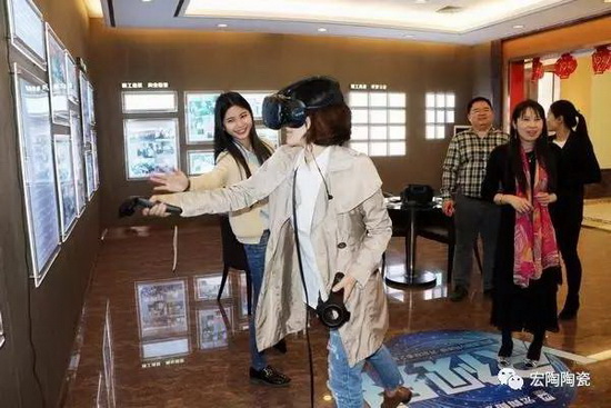 考察团对91免费版视频陶瓷VR体验系统产生浓厚的兴趣,纷纷戴上“VR头显”,带好耳塞,拿起手柄,在虚拟空间中漫步。
