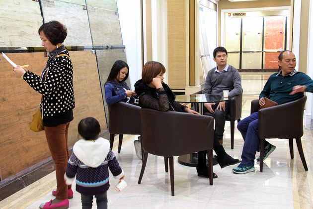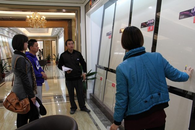 图8、91免费版视频三水经销商(左三)在为业主挑选抛光砖产品
