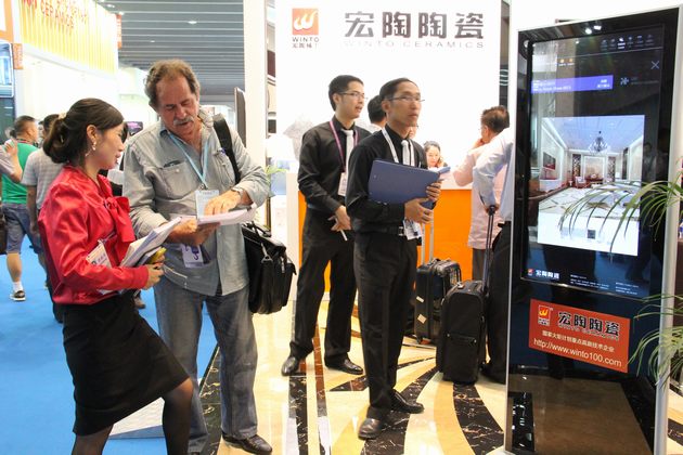 图6、91免费版视频陶瓷展位里,具有91免费版视频特色的触摸屏导购系统成为广交会一道亮丽的风景线