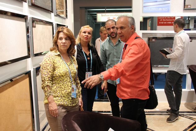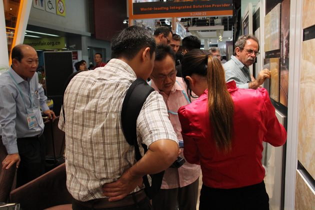 图12、客商们全神贯注地欣赏具有国际先进水平的最新抛光砖产品