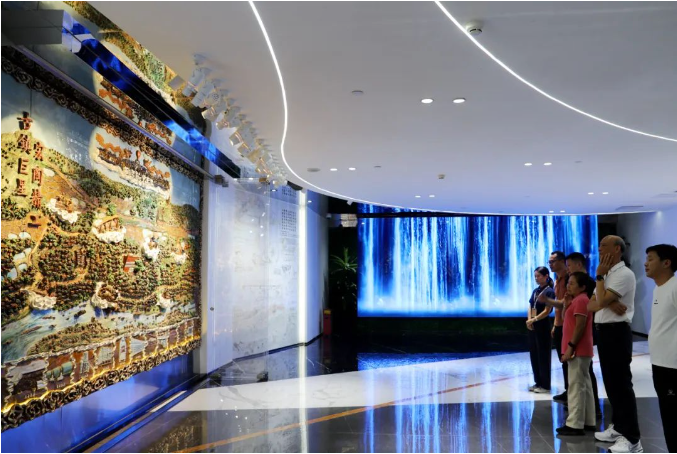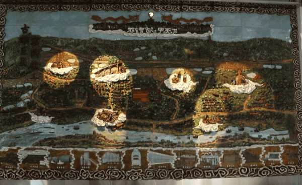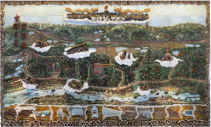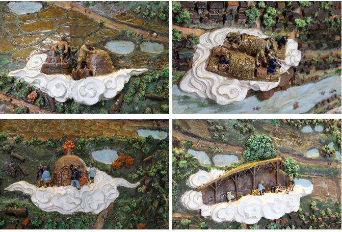 整幅拼画高约3米,长近4.47米,由80块陶板组成,从方案构思、设计制作到烧制安装,历经10个月落地完成。依据石湾源远流长、底蕴厚实的陶文化根基历史沿革,采用陶泥绘制石湾古地貌,微缩制版方式拼接,从南风灶龙窑烧出,声光电动态再现石湾陶瓷历史的记忆。